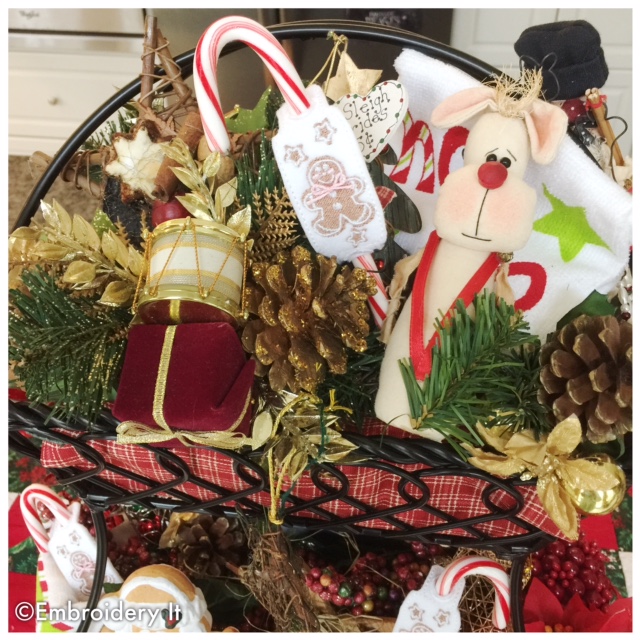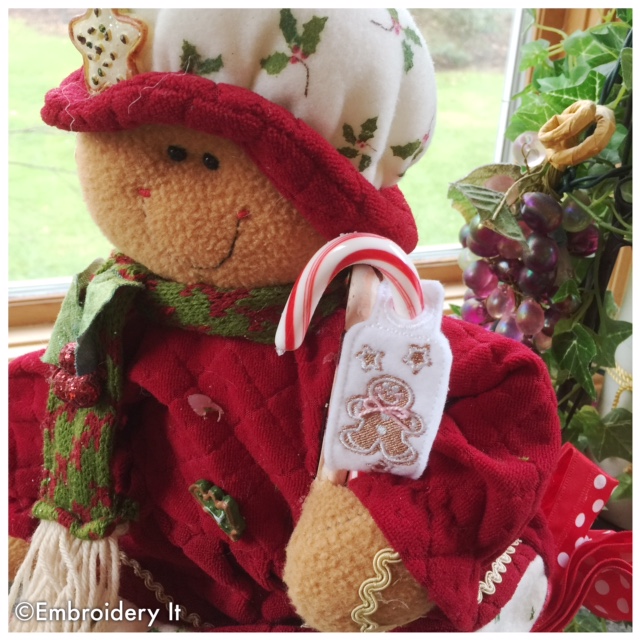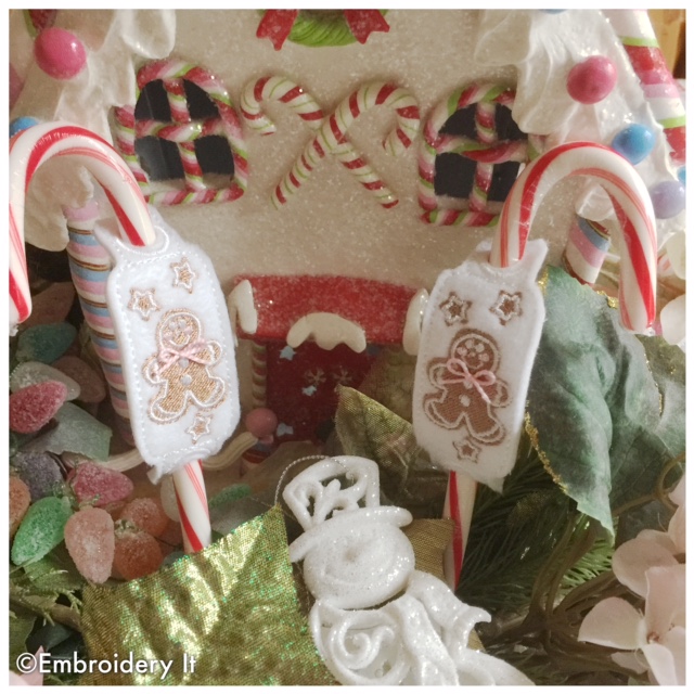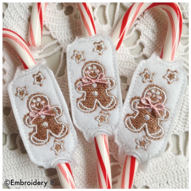 In Michigan the snow is coming. We have about 4 inches and it is expected to continue much of the weekend. This means it is a good weekend for hunkering down at the embroidery machine. Today’s afternoon schedule at our home has me in the kitchen making Christmas cookies followed by making some embroidery gingerbread men as well. The plan is to make plates of cookies for the neighbors and include one of these little candy cane sliders in with each plate. A sweet finishing touch.