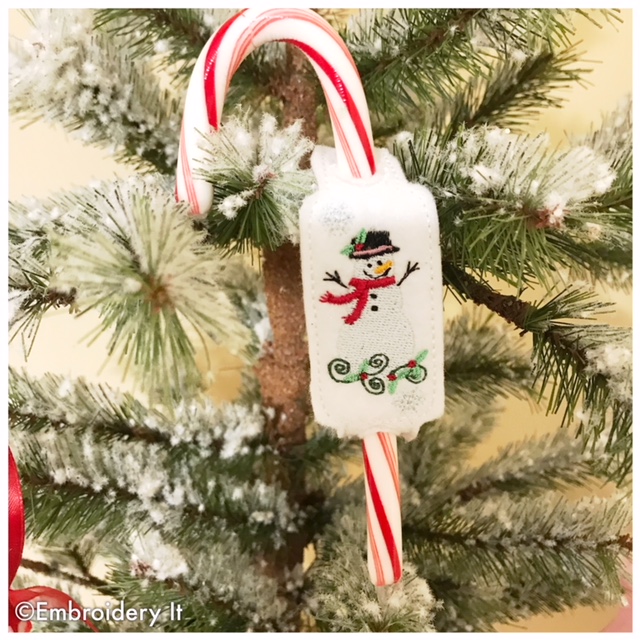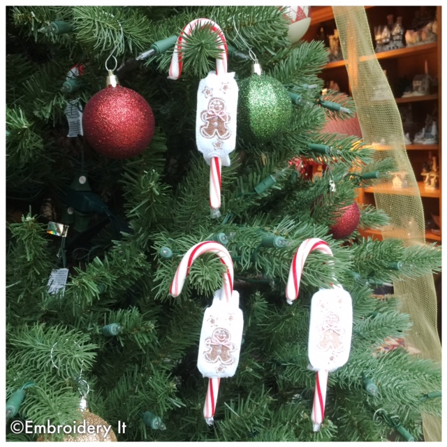 You make 3 in your 4 x 4 embroidery hoop at one time. The design is stitched on felt and then just cut out the center of the large eyelets to insert the candy cane.