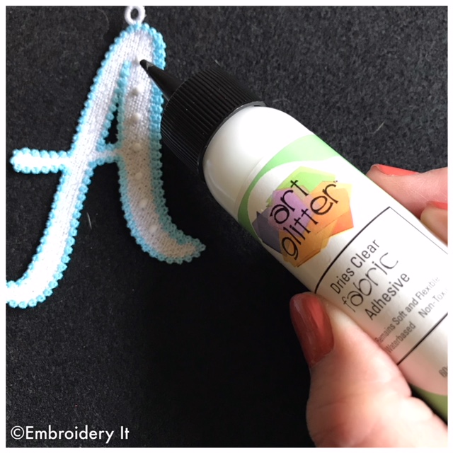 The rhinestones shown here are 3 mm “hot fix” rhinestones. That is what I just happened to have on hand. I used clear drying fabric glue as I feel trying to heat set the rhinestones would cause the polyester embroidery thread to melt. FYI, I think a 5 mm rhinestone would look even prettier.