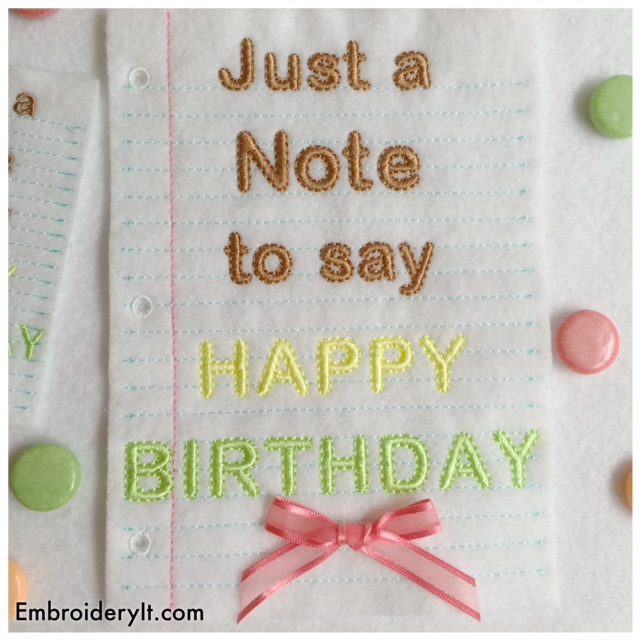 Remember those handwritten notes we would write on paper and pass in school? Sometimes just a simple note to say “Happy Birthday” is needed and nothing is better than a machine embroidered note. Even the notebook paper, which is white felt here, is part of the design! But you could use any white fabric. Pure simple country charm.