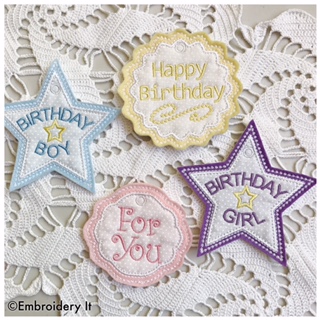 3 designs in this set of full size Birthday Candy Bar Wrappers. Make them in your 5 x 7 hoop. Perfect for giving to guests, tucking in treat bags or including in your gift to the birthday boy or girl.