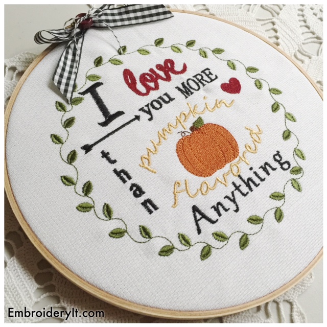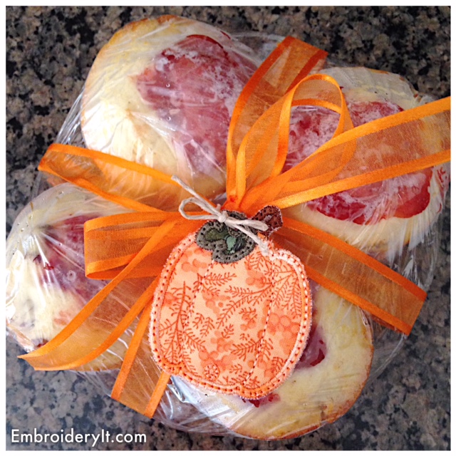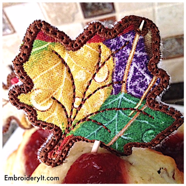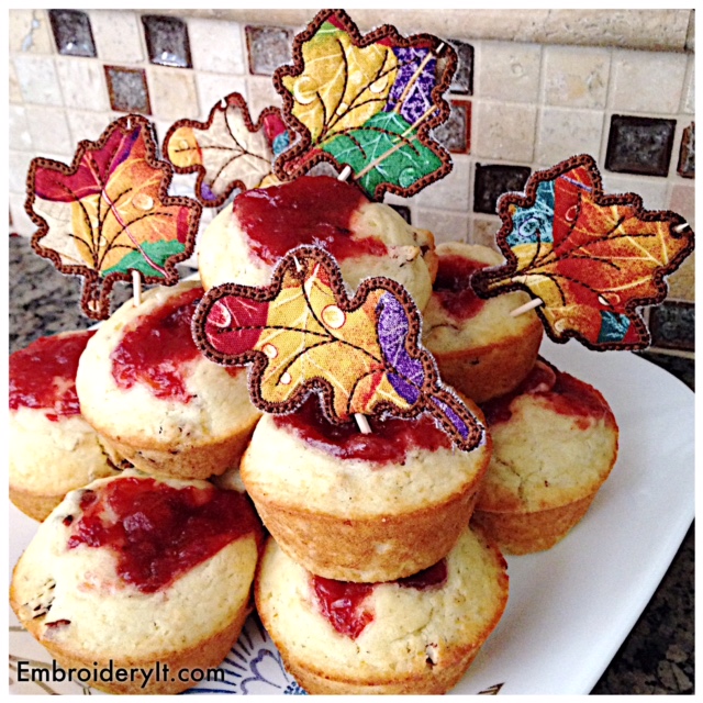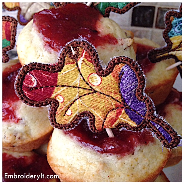 I feel the need to spend time in the kitchen whipping up comfort foods. The Embroidery JAM Fall set makes a perfect muffin topper when making the small size. To learn more about Embroidery JAM, you can read this post here, but basically it is a mix and match of designs as you please.