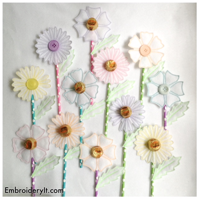 I love how these turned out and how just changing the felt gave them a whole new look. An entire bouquet of machine embroidery flowers were made in about an hour!