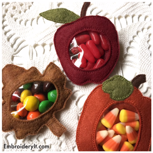 For you Saturday stitching pleasure I want to show off the Fall Candy Holder set made in your 4 x 4 machine embroidery hoop. Candy holders make super quick and easy gifts and are a great way to add simple decorative touches to your home.